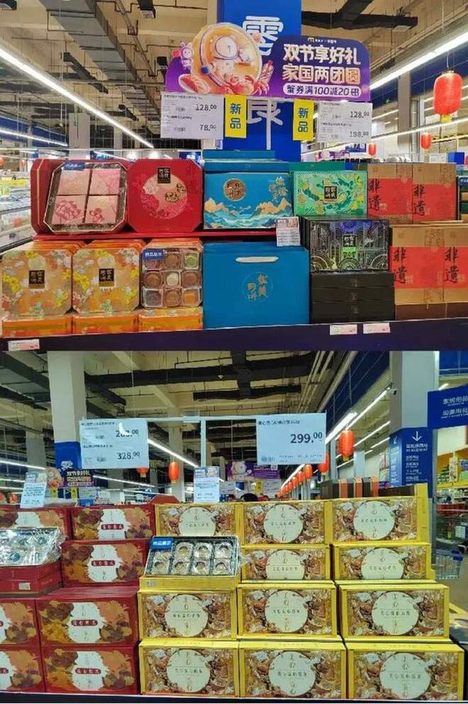 线下大型超市的月饼礼盒,少了些往年的“贵气”。