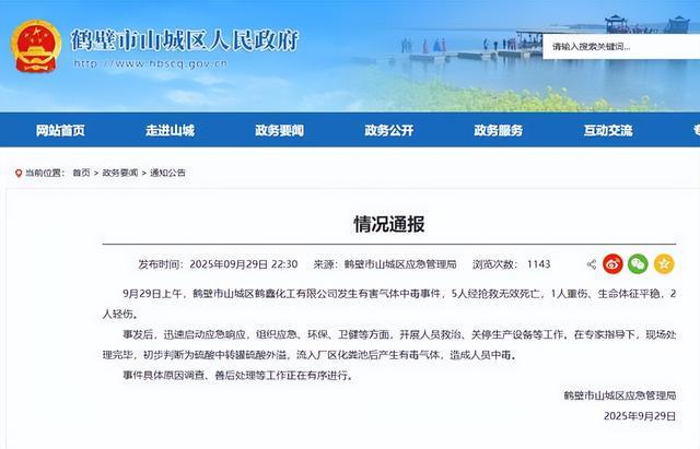 9月29日,河南省鹤壁市山城区应急管理局就辖区内一起安全生产事件公开发布情况通报。情况通报称,9月29日上午,鹤壁市山城区鹤鑫化工有限公司发生有害气体中毒事件,5人经抢救无效死亡,1人重伤、生命体征平稳,2人轻伤。