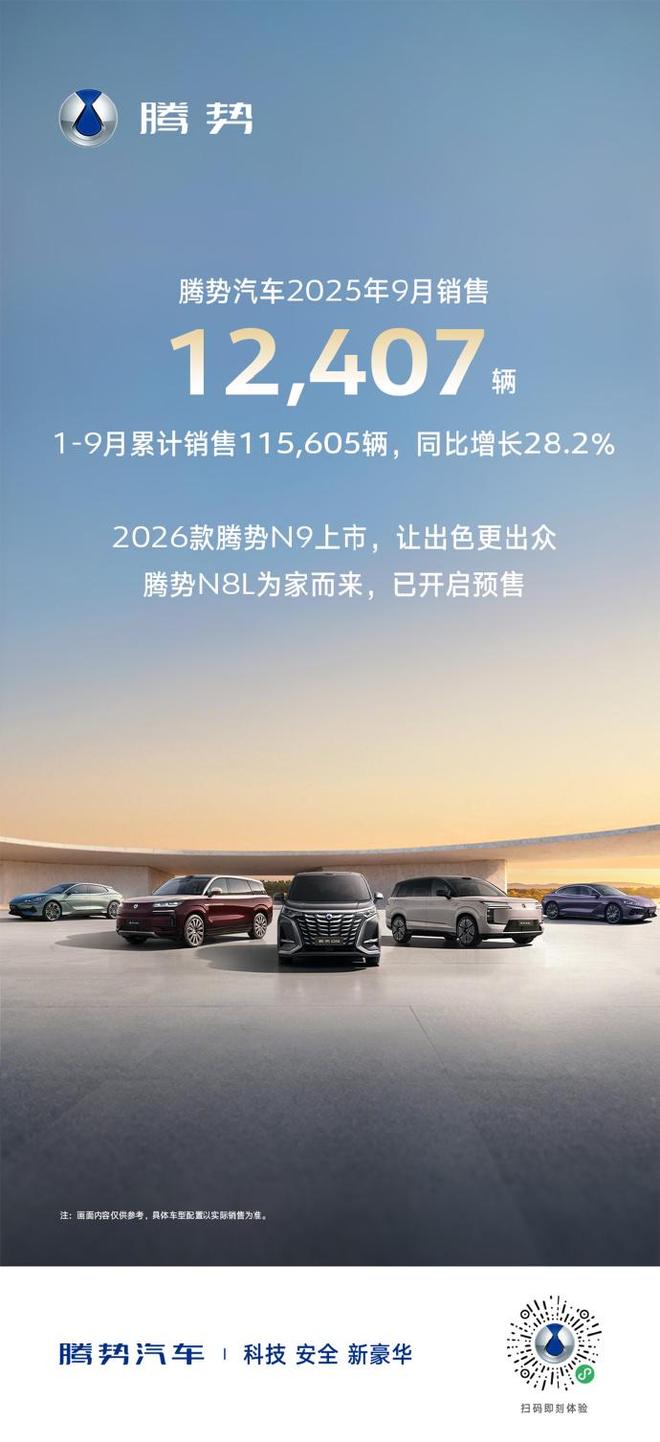 近日,腾势汽车公布了9月销量成绩,腾势汽车9月销售12407辆,1-9月累计销售115605辆,同比增长28.2%。