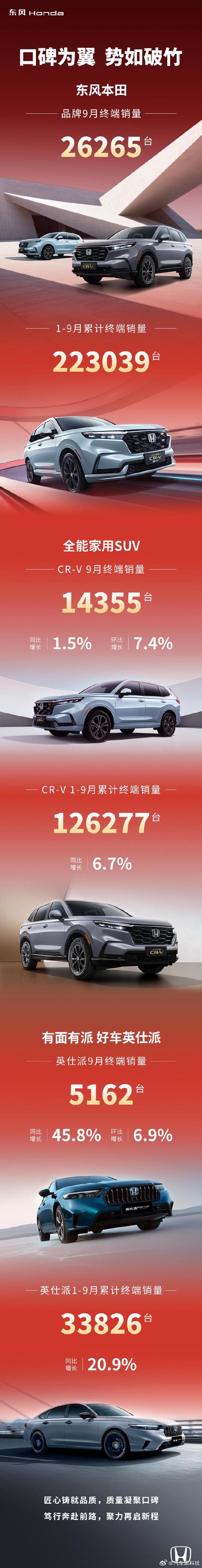 东风本田公布9月销量数据:9月终端销量26265辆,1-9月累计销量223039辆。