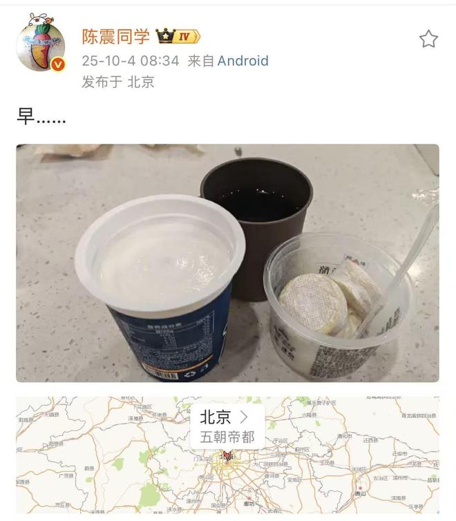 今日,在劳斯莱斯车祸第二天,陈震照常发布微博晒早餐,并配文“早……”。