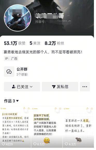 8月2日,潇湘晨报记者查看涉事男子短视频账号,发现此前其发布的视频均已不存在。其最新公布的视频称:“目前家里和我都安好,感谢大家的关心,没有人再找我家里人麻烦,也没有相关人员联系我,处理结果请关注官方通报。”其个性签名为:“要勇敢地去做那个发光的人,而不是等着被照亮。”