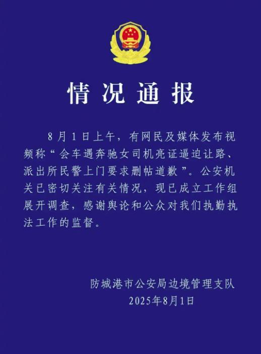 会车遇奔驰女司机亮证逼迫让路,女司机“亮证”威胁,并凭车牌报出对方地址和姓氏,后派出所民警上门要求删帖道歉,近日,广西一男子反映的此事持续引发热议。8月1日,广西边检总站防城港边境管理支队通报称,已成立工作组调查此事。