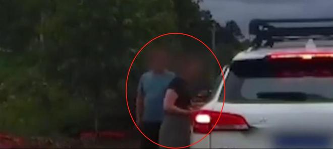 跟在男子车后的车辆,其记录仪拍到了上述画面:女子右手拿着手机,将左手中攥着的物品展示了一下,女子又称报警。