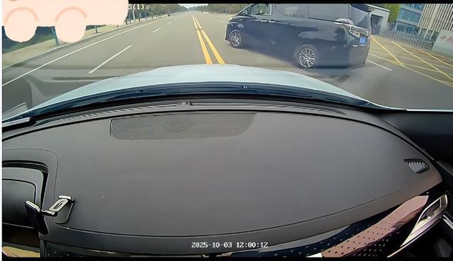 3分39秒时长的行车记录仪画面显示,10月3日11:58,司机载着两位乘客正常行驶当中,前面一辆悬挂晋LE696X车牌号的黑色丰田车不顾网约车鸣笛,突然往右变道。