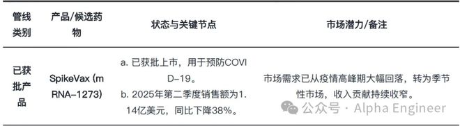 RSV疫苗mRESVIA (mRNA-1345) :作为公司在呼吸道合胞病毒(RSV)领域的首个产品,已获批用于18-59岁高风险成人及60岁以上人群,标志着公司产品组合开始向新冠以外的领域拓展。