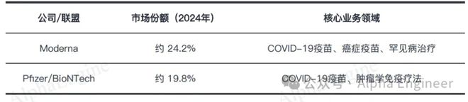 双方在COVID-19疫苗和癌症治疗领域均有深度布局,构成了市场主导力量。