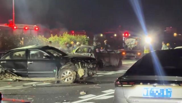 有现场视频显示,过路车辆从损毁的车辆中小心穿行,有车辆燃起熊熊大火。有消防救援车到场,有交警和消防员在处理现场。