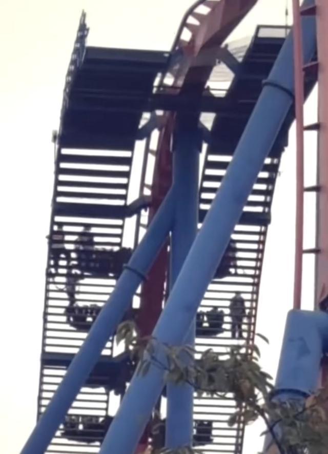 视频显示,过山车在爬升接近坡顶时停止,因高度较高,乘客只得在工作人员的引导下,沿设备旁检修扶梯依次撤离。