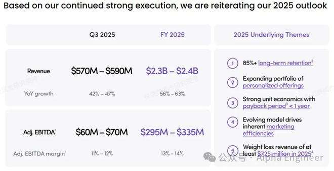 截止25Q2,HIMS的订阅用户数超240万,其中高价值的个性化订阅用户占比达61%且同比增长89%,叠加超85%的用户留存率,显示出强大的用户粘性和货币化潜力。