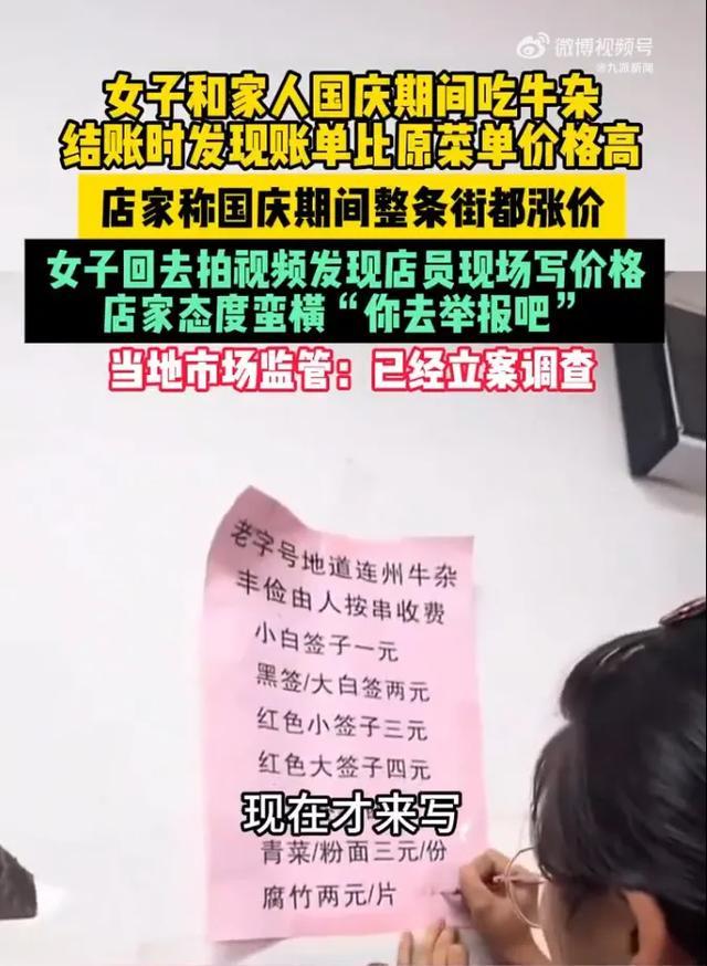 此前据报道,10月4日,女子和家人在广东连州一家牛杂店吃饭,结账时感觉价格偏高,核算发现总价与墙上价格表对不上。女子提出质疑,店主才称国庆期间整条街都涨价,并催促女子买单。女子不情愿地支付了203元后想拍视频取证,店家态度蛮横说“你去举报吧”,并当面拿笔在墙上改菜品价格。
