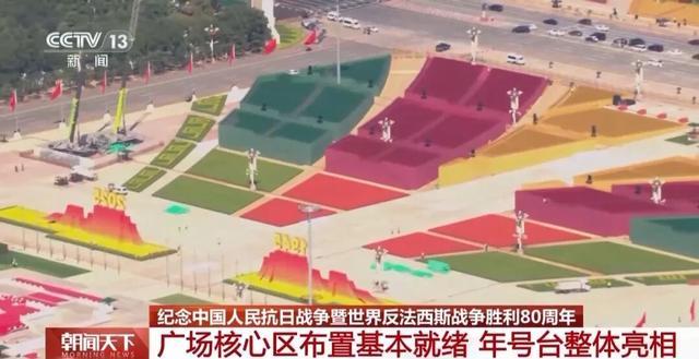 总台记者 邵薇:此次纪念活动,天安门广场的景观布置遵循“尚中”的原则,也就是以北京中轴线为主要通道,两侧对称布局。在颜色的选择上也相对统一且庄重,分别是红、金、绿。最具代表性的是这两座年号台,宛若两扇矗立的大门缓缓拉开一场大幕。同样,它也选择了长城这一国际性的文化符号。 最下方绿色的自然花境象征着大地,而在大地之上是缓缓升起、泛着金光的红日,不仅托举起两个重要的年份,更是象征着中华民族前进的曙光。在正式活动当中,三军仪仗队将会在人民英雄纪念碑下集结出发。