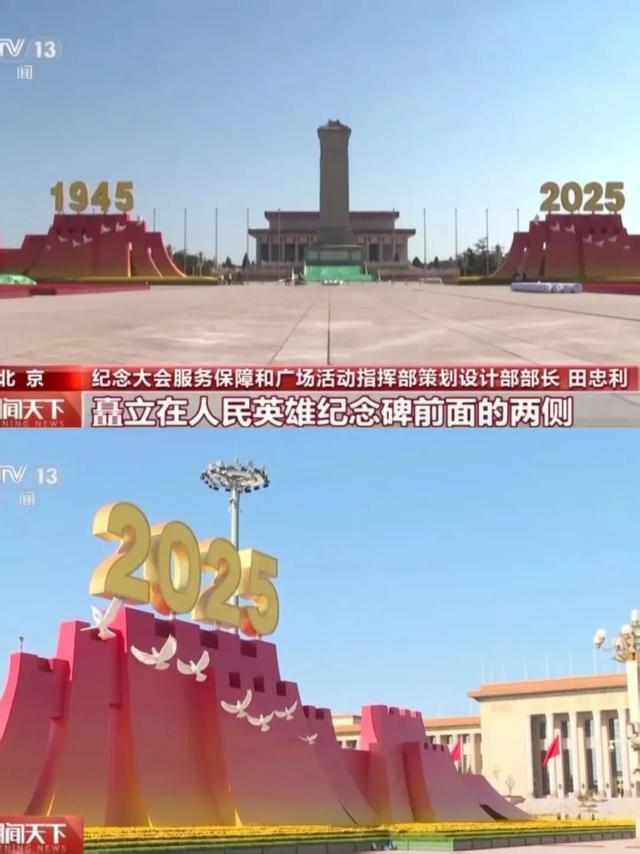 纪念大会服务保障和广场活动指挥部策划设计部部长 田忠利:整个广场布局上来说,我们把年号台矗立在人民英雄纪念碑前面的两侧,托举起1945、2025年号。很好地阐释了“众志成城”纪念大会的主题。