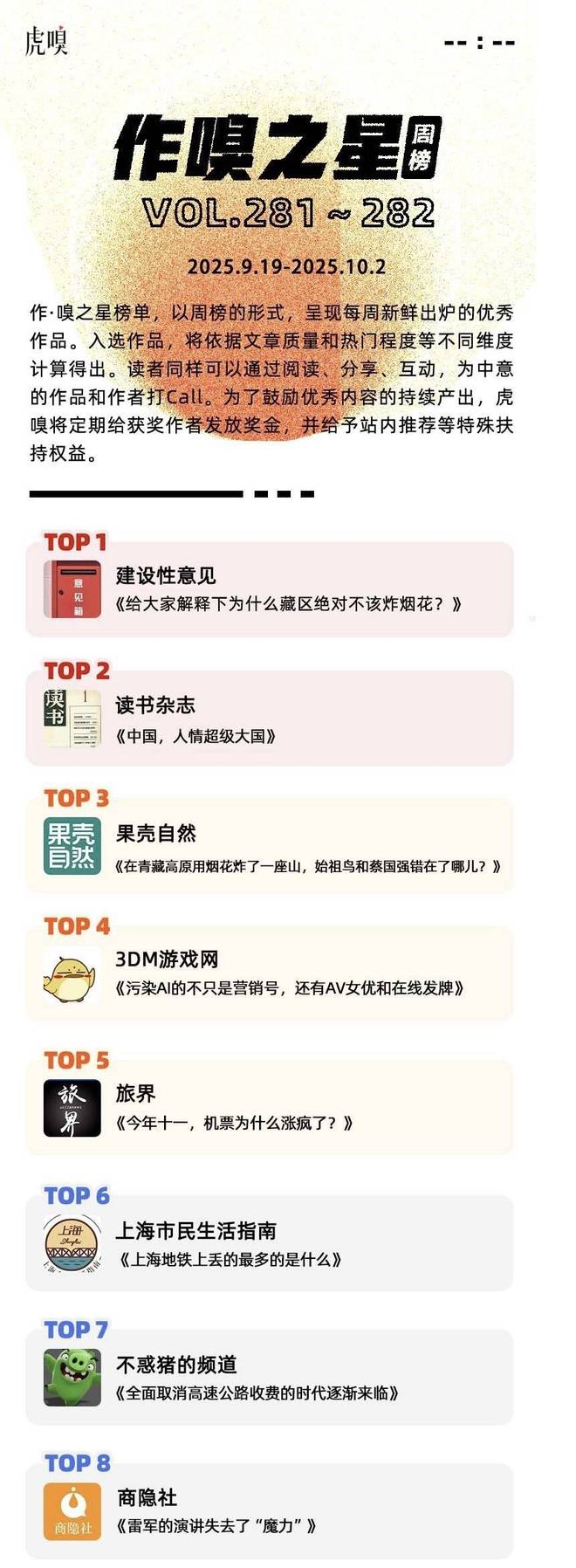 作·嗅之星榜单,以周榜的形式,呈现每周新鲜出炉的优秀作品。2025年9月19日~2025年10月2日,虎嗅第281~282期,作·嗅之星的获奖文章分别是: