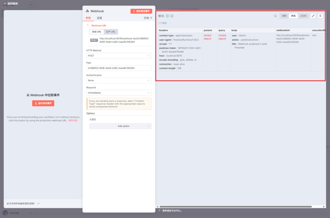 - 发送成功后,你切回 n8n 的界面,会发现 Webhook 节点已经“亮了”,并成功捕获到了你从 Postman 发送的数据。