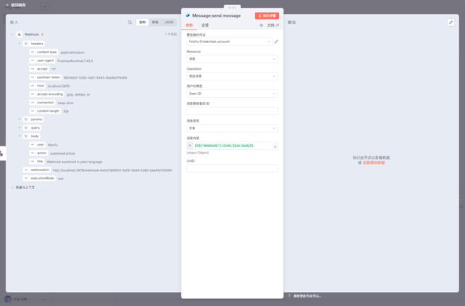 理论、代码、工具都盘完了,咱们最后回归到那个最初的问题场景:“用 n8n 通过 webhook 发送飞书信息”。