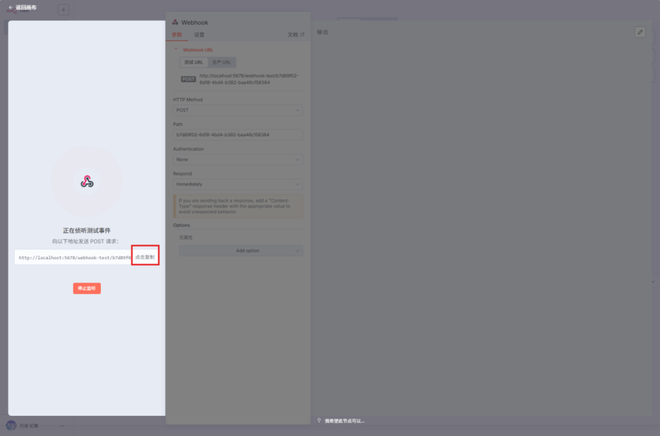 节点进入监听状态后,你会在 Webhook URLs 下看到一个 Test URL。点击它旁边的复制按钮。