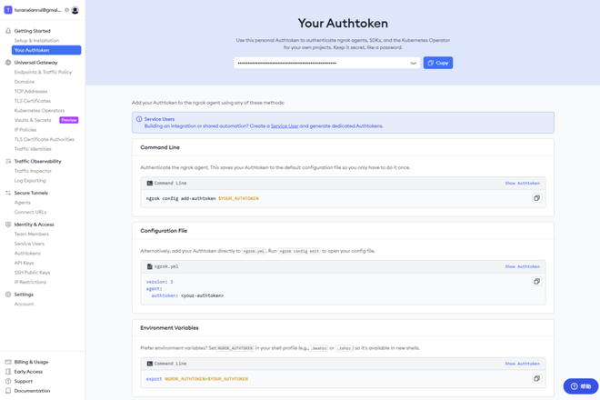 - 获取令牌 (Authtoken):访问 https://dashboard.ngrok.com/signup 注册一个免费账号(用 Github 或 Google 登录最快)。登录后,在左侧菜单找到 “Your Authtoken”,复制那一长串令牌字符。