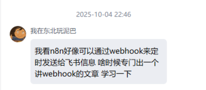 他问:“我看 n8n 好像可以通过 webhook 来定时发送给飞书信息,啥时候专门出一个讲 webhook 的文章学习一下?”