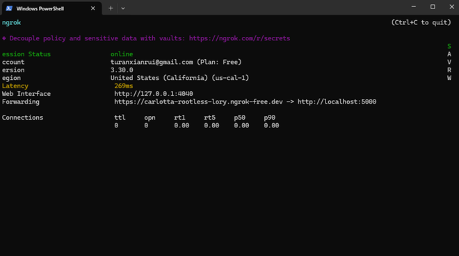 - macOS/Linux/CMD: ngrok http 5000 (这里的 5000 必须和你 app.py 里的端口号一致)。