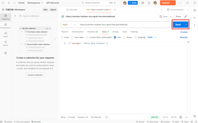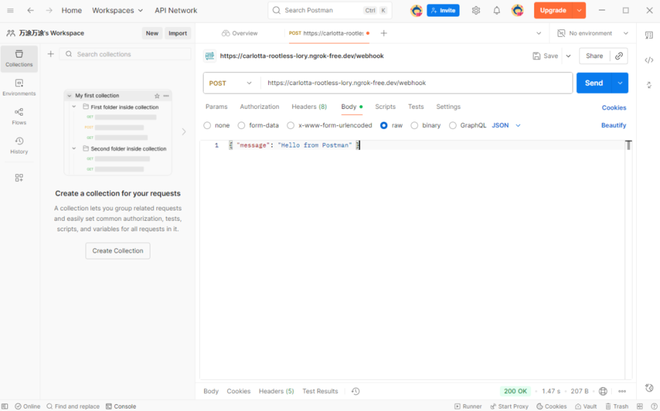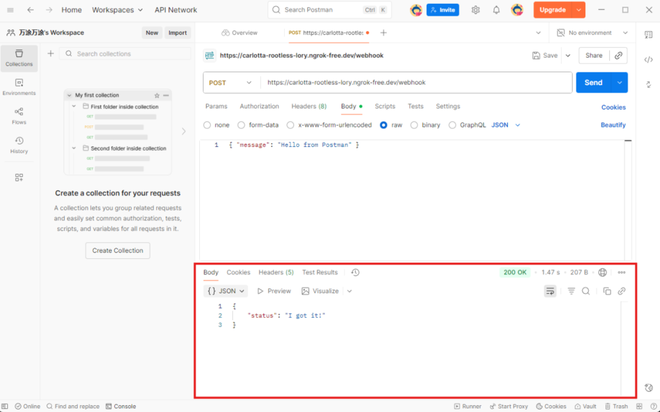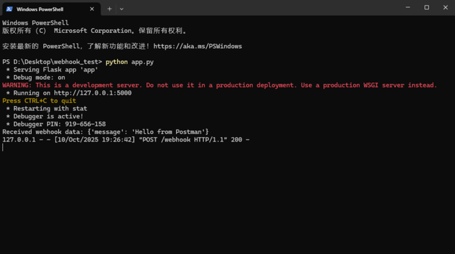 - 在你第一个命令行窗口(运行 app.py 的那个): 你会看到打印出了 Received webhook data: {'message': 'Hello from Postman'} 的字样。