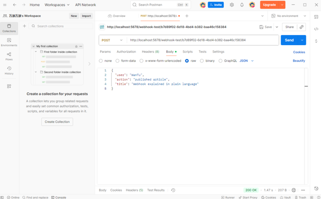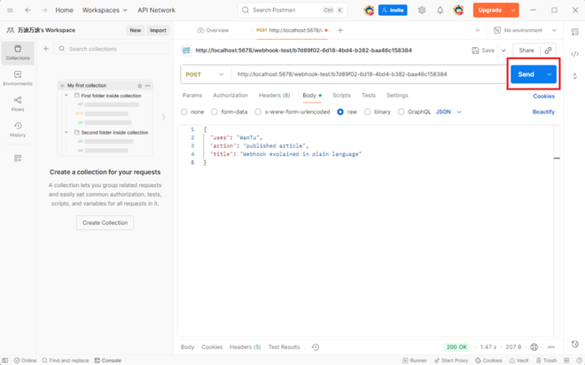 - 现在咱们没有现成的系统来触发,正好把上一节的 Postman 派上用场。