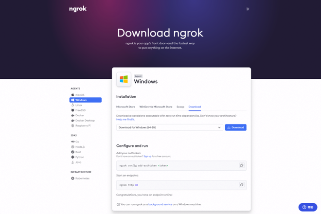 - 下载:根据你的操作系统,下载对应的 Ngrok 压缩包并解压,你会得到一个 ngrok.exe (Windows) 或 ngrok (macOS/Linux) 文件。