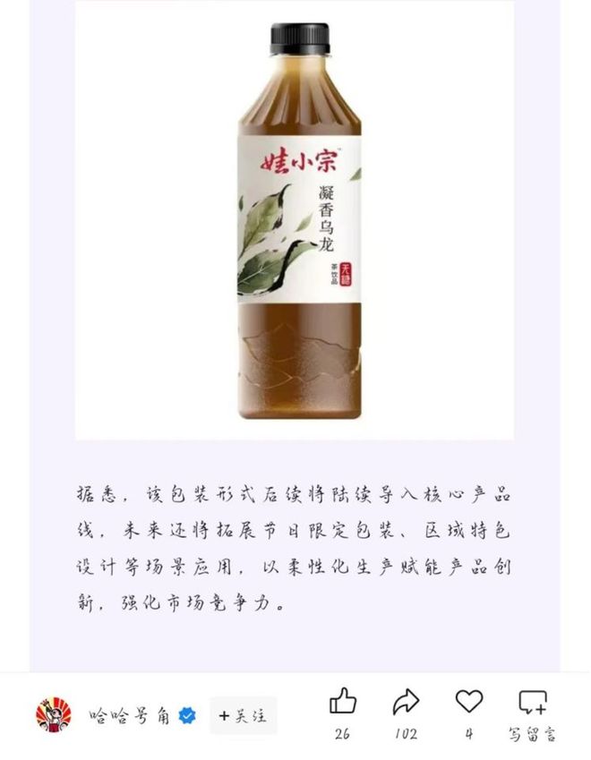 5月12日,娃哈哈集团官方公众号“娃哈哈家园”(现更名“哈哈号角”)发文中,亦曾曝光了一款以“娃小宗”为名的无糖茶饮料,口味为“凝香乌龙”。
