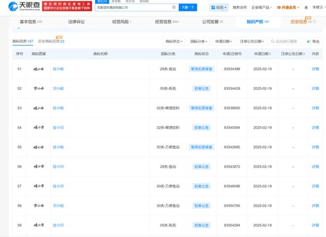 据天眼查显示,由宗馥莉主导的宏胜饮料集团有限公司在今年的2月份至5月份申请了多个涵盖不同领域的“娃小宗”商标以及类似的“娃小哈”、“宗小哈”等商标。