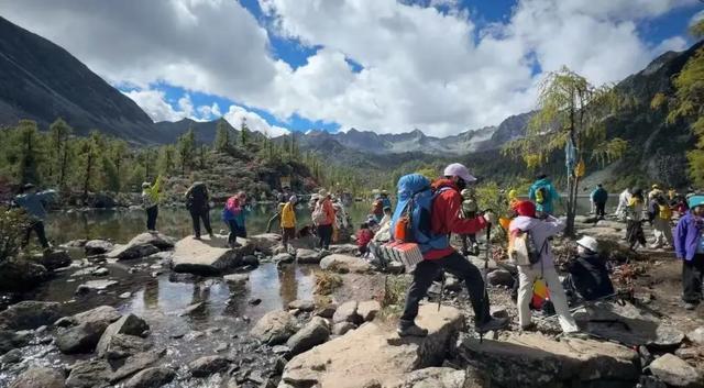 虽然因为高反她几乎只爬了小半程,但令她意外的是,海拔3000多米的党岭村里,居然挤满了人。在前往海拔4100米高的葫芦海那一路上,有的人装备齐全,有的人甚至就像公园遛弯儿一样的普通穿着,“但每个人看起来都比我能爬”。