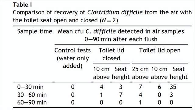 另外,马桶盖也是遮挡气溶胶的重要法宝。2012年,英国利兹大学医学院微生物学系教授马克·H·威尔科克斯等通过在马桶上方三个不同高度(马桶座高度、马桶座上方10厘米和25厘米)采集空气样本,评估艰难梭菌在冲水过程中的气溶胶化情况。结果显示,在马桶盖关闭的情况下,空气样本中未检测到以气溶胶形式传播的艰难梭菌。
