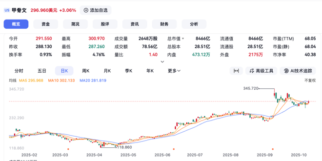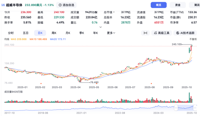 2025年10月6日当天,AMD股价开盘后直接跳涨超过30%,最高触及215美元每股,最终收涨23.71%。