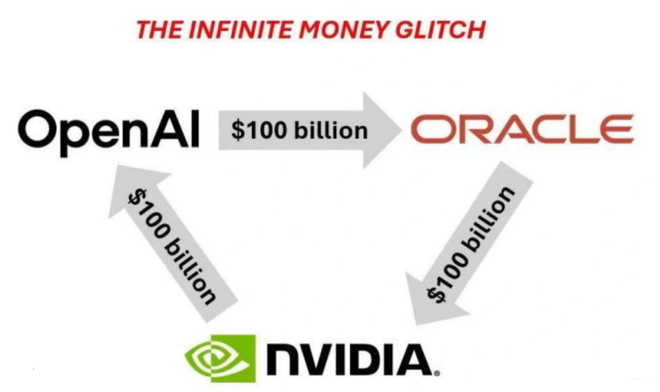 人们发现,英伟达承诺投资给OpenAI1000亿美元,OpenAI又和甲骨文签订了多年3000亿美元的合约,最终甲骨文其实还要从英伟达采购芯片——一个循环,形成闭环。而就在这闭环当中,AI更热了、股价更高了。