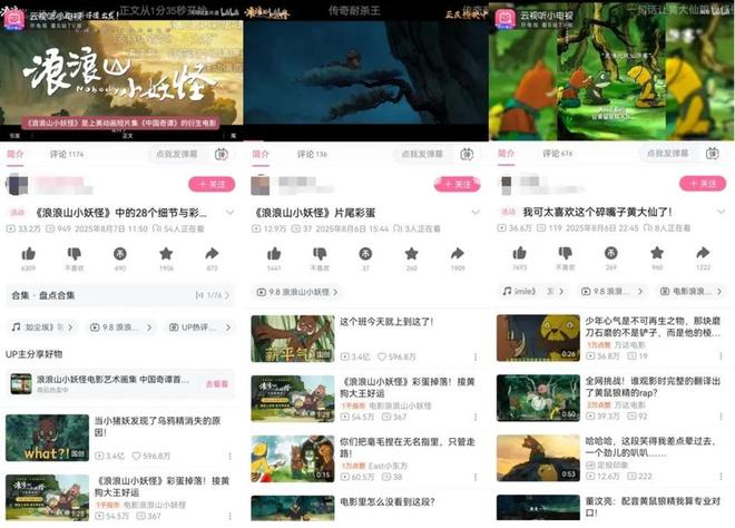切片视频的传播同样“量大管饱”。《浪浪山小妖怪》、《罗小黑战记2》等动漫作品以B站为主阵地,官方账号、up主二创齐发力,“罗小黑战记2笑点”、“小黑吃播”、“小妖怪彩蛋”、“碎嘴黄大仙”等话题都成为站内热门。