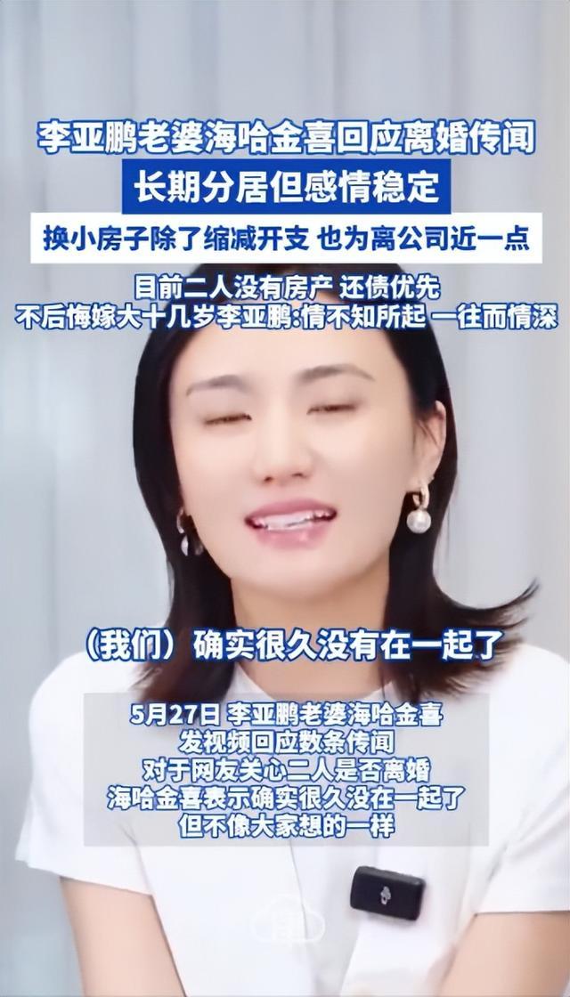 5月27日,李亚鹏妻子海哈金喜发视频回应数条传闻,对于网友关心二人是否离婚,海哈金喜表示确实很久没在一起了,但不像大家想的一样。“春节后鹏哥开始上山下乡给大家找好的茶叶,我从去年底也是成立了自己的工作室,就有很多杂事,所以确实两个很久没有在一起了,但是并没有出什么问题或者离婚。”
