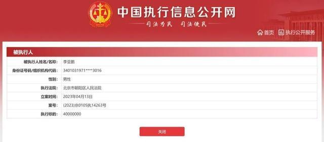据悉,中国执行网4月27日显示,李亚鹏及哥哥李亚炜近日新增一则被执行人信息,执行标的4000万元,涉及合同纠纷案件,执行法院为北京朝阳法院。