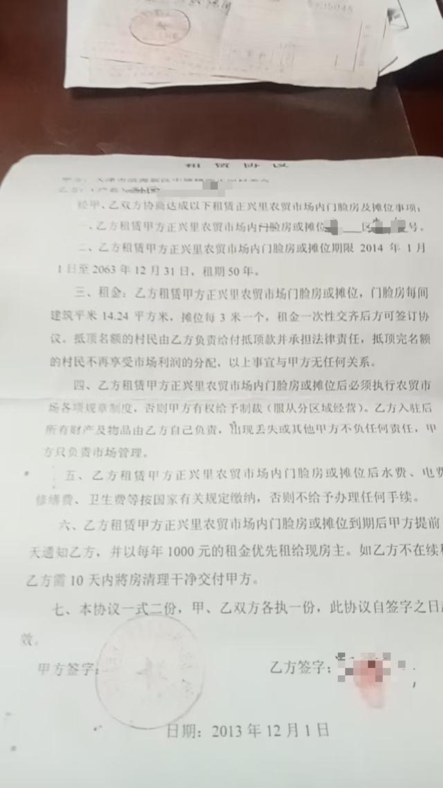 58岁孙先生介绍,2013年底,天津市大港区(现滨海新区)中塘镇西正河村村委会建成综合农贸市场后,他与村委会签订租赁协议,“我有交费的单据,它是租赁形式,一租就是50年,一个门面房实用面积12㎡是30万,一个3米长台子(摊位)是30万。”