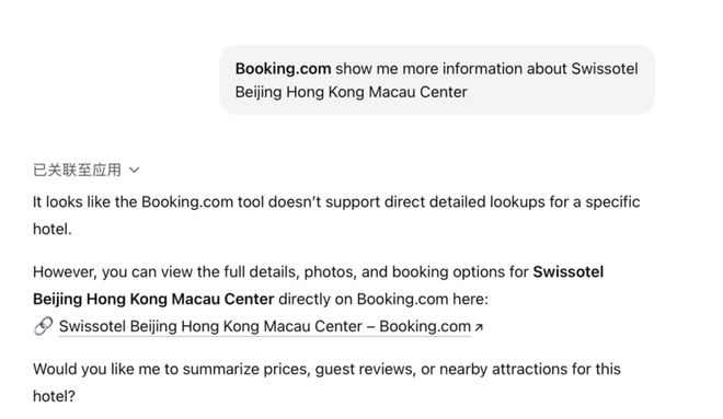 当我再继续要求Booking给我介绍一家酒店的详细信息时,ChatGPT会显示目前不支持查看App内的酒店的详细信息,只能像之前一样整理成文字信息呈现在聊天界面中。这也就意味着,Booking在ChatGPT内的嵌入,目前还只能给我们提供一个以网页形态呈现的搜索结果,和之前的列表方式没有本质区别。