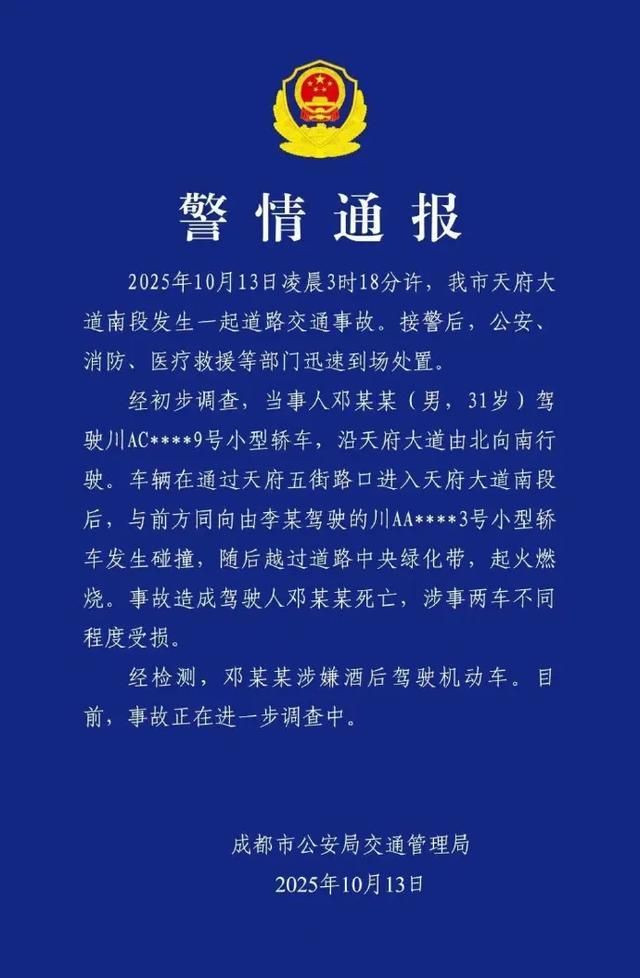 10月13日,成都市公安局交通管理局通报一车辆起火:13日凌晨3时,31岁男子邓某某驾车在天府大道南段,与前方小轿车发生碰撞,随后越过道路中央绿化带,起火燃烧。事故造成驾驶人邓某某死亡,涉事两车不同程度受损。经检测邓某某涉嫌酒后驾车,事故正在进一步调查中。