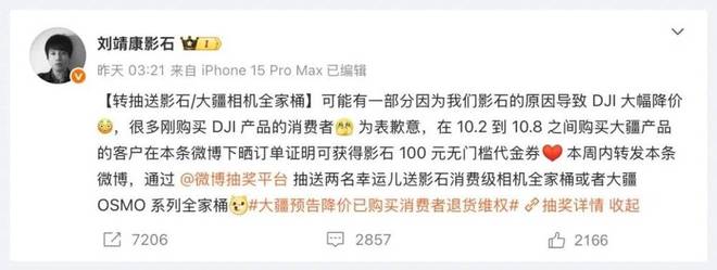 倒是大疆的竞争对手、影石 Insta 360 的创始人兼 CEO 刘靖康昨日(10 月 13 日)公开对外“致歉”。他称,“可能有一部分因为我们影石的原因导致 DJI 大幅降价。”“为表歉意”,他将为 10 月 2 日至 10 月 8 日期间购买大疆产品的用户提供 100 元影石无门槛代金券。