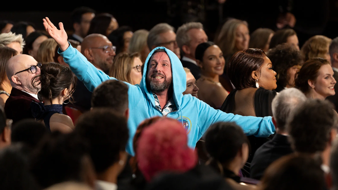 美国演员Adam Sandler在今年的奥斯卡颁奖典礼上穿着大帽衫就来了。