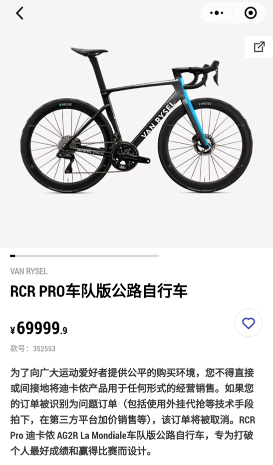 如今,走进一家迪卡侬门店,这份割裂感正越来越强:一边是59.9元的促销防晒衣,另一边是69999元的VAN RYSEL公路车。