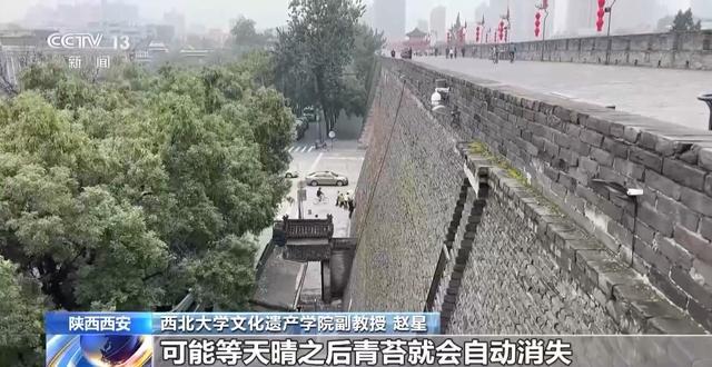 西北大学文化遗产学院副教授 赵星:这是西安城墙近年来第一次长青苔,大家不必过分担心,可能等天晴之后青苔就会自动消失。