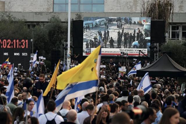 10月13日,在以色列特拉维夫,人们通过大屏幕观看被哈马斯扣押人员释放直播。图/新华