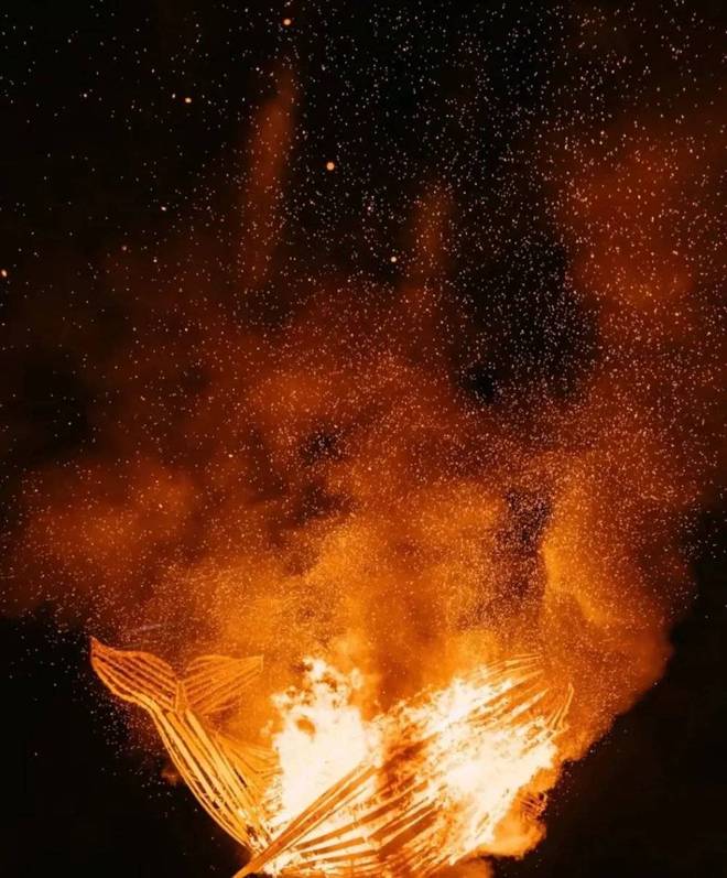 傍晚时分,工人们开始在海滩上布置晚上的活动。他们用铁丝网和木板搭建了一头高约7米、长13米的巨型鲸鱼装置。不久前,仿照美国由来已久的火人节,阿那亚曾上演过“一鲸落,万物生”篝火仪式。