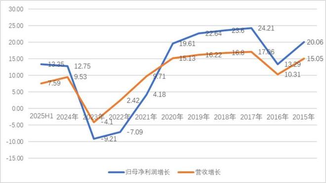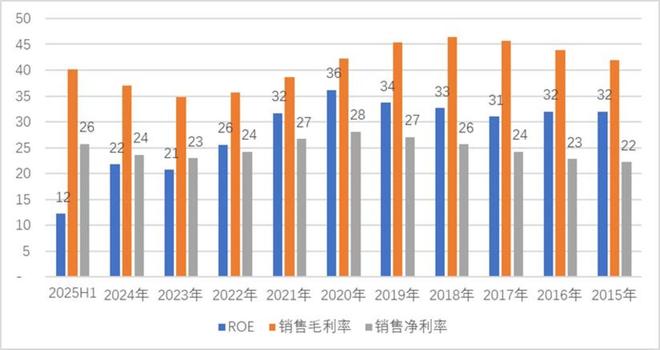 公司业绩从高速增长步入了平台期,2022年至2025年半年报其营收增长分别为2.42%、-4.1%、9.53%、7.59%,净利润增长分别为-7.09%、9.21%、12.75%、13.35%,年化净利润增长不足3%。与此同时,其ROE亦较前期大幅下滑,2022年至2025年半年报分别为26%、21%、22%、12%(年化为24%)。