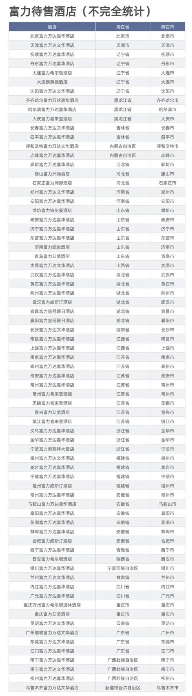 而近期被摆上货架折价抛售的,还有泉州富力万达文华酒店、廊坊富力万达嘉华酒店、宁德富力万达嘉华酒店......