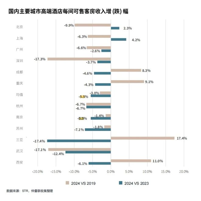 以全国12个核心城市为样本,平均RevPAR下跌5.5%。