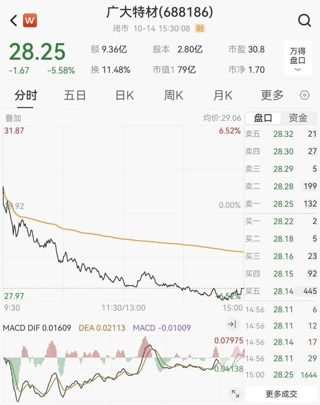 截至10月14日收盘,广大特材股价报28.25元/股,总市值为79亿元。