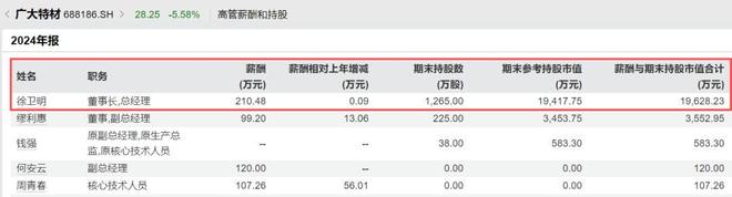 2024年年报显示,徐卫明2024年年薪为210.48万元。截至2025年6月末,徐卫明直接持有广大特材1265万股,持股占比为5.6%。